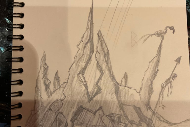 Then I switch to the tablet, and digital work. At this point, my sketch changed drastically (all I kept were the 2 stalagmites), since I thought the beach atmosphere was not mysterious enough, so I went full claustrophobic here: